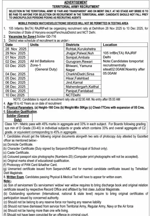 Territorial Army TA Recruitment Rally 2025; The 105 Infantry Battalion (Territorial Army) has released a notice regarding the recruitment rally on 17th October 2025 for the domicile candidates from the State of Haryana (except Panchkula district) and NCT Delhi. A total of 716 vacancies have been announced for the post of Soldier (General Duty) under Zone-I. Candidates who are interested can read the Territorial Army TA Recruitment Rally 2025 details in the article below.